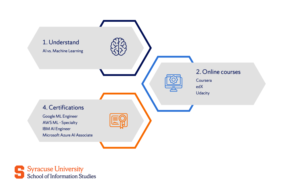 When pursuing a career in AI engineering, it’s helpful to understand the difference between machine learning vs. AI, as this distinction forms the basis for building a strong foundation in the field. Once you’re familiar with the fundamentals, online courses and certifications can provide valuable hands-on experience and theoretical knowledge.